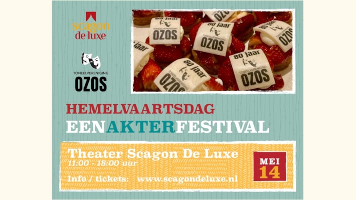 In het kader van haar 80-jarig bestaan organiseert Toneelvereniging OZOS in nauwe samenwerking met Scagon De Luxe nu opnieuw een Eenakterfestival. Verdeeld over twee dagdelen worden zeven heel verschillende inzendingen gespeeld en na afloop van het tweede dagdeel is er gelegenheid tot ’nazit’.