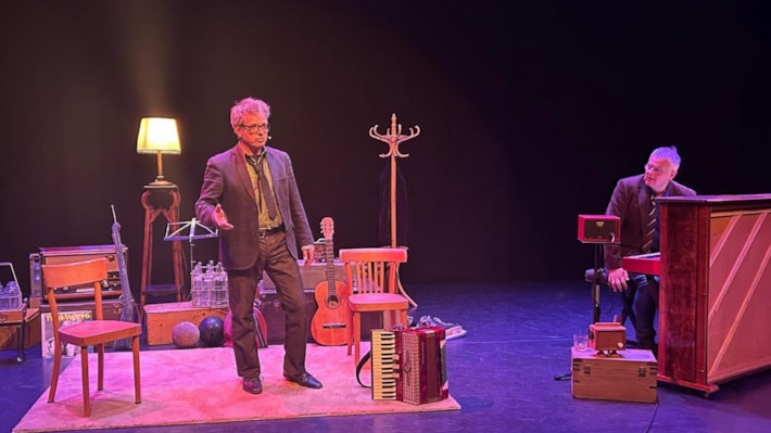 Theaterconcert Een avond met De Neven. De Neven zijn: Maarten Overtoom (muziek, piano, zang) en Jos van Venrooij (teksten, zang en een beetje accordeon)