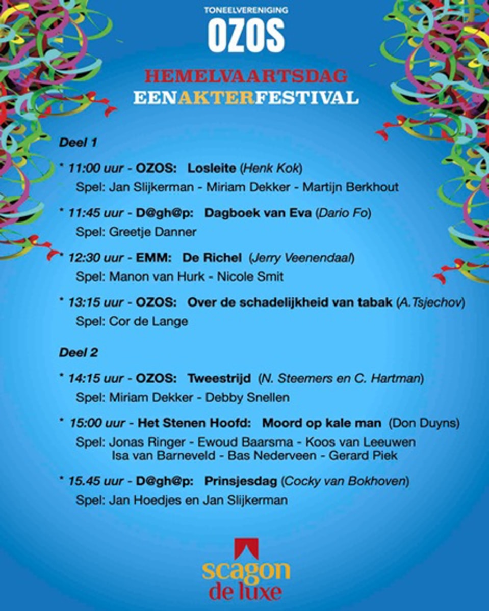 In het kader van haar 80-jarig bestaan organiseert Toneelvereniging OZOS in nauwe samenwerking met Scagon De Luxe nu opnieuw een Eenakterfestival. Verdeeld over twee dagdelen worden zeven heel verschillende inzendingen gespeeld en  na afloop van het tweede dagdeel is er gelegenheid tot ’nazit’.