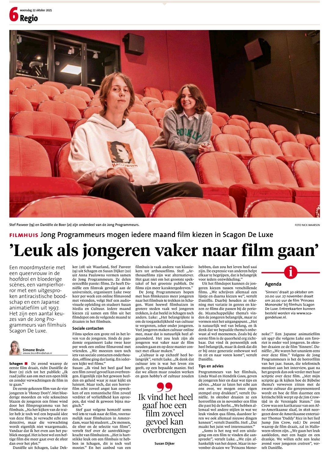 | LukeIk ben Luke 28 jaar en ben nu ik in dit team ben, op twee manieren programmeur. Sinds de pandemie organiseer ik online met vrienden tweemaal per week een filmavond. Daar kijken we films van bijna alle genres, zo heb ik ook films ontdekt die ik anders niet zou kijken, en ben gaan waarderen. Hier zitten films bij waarvan ik het jammer vind dat niet meer mensen ze kennen en ik hoop dat we die met dit team jong programmeurs naar het zilveren scherm van het Scagon kunnen brengen.